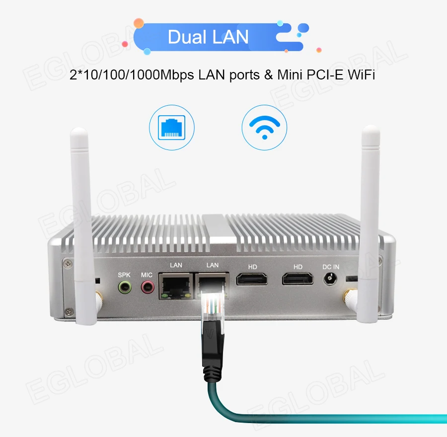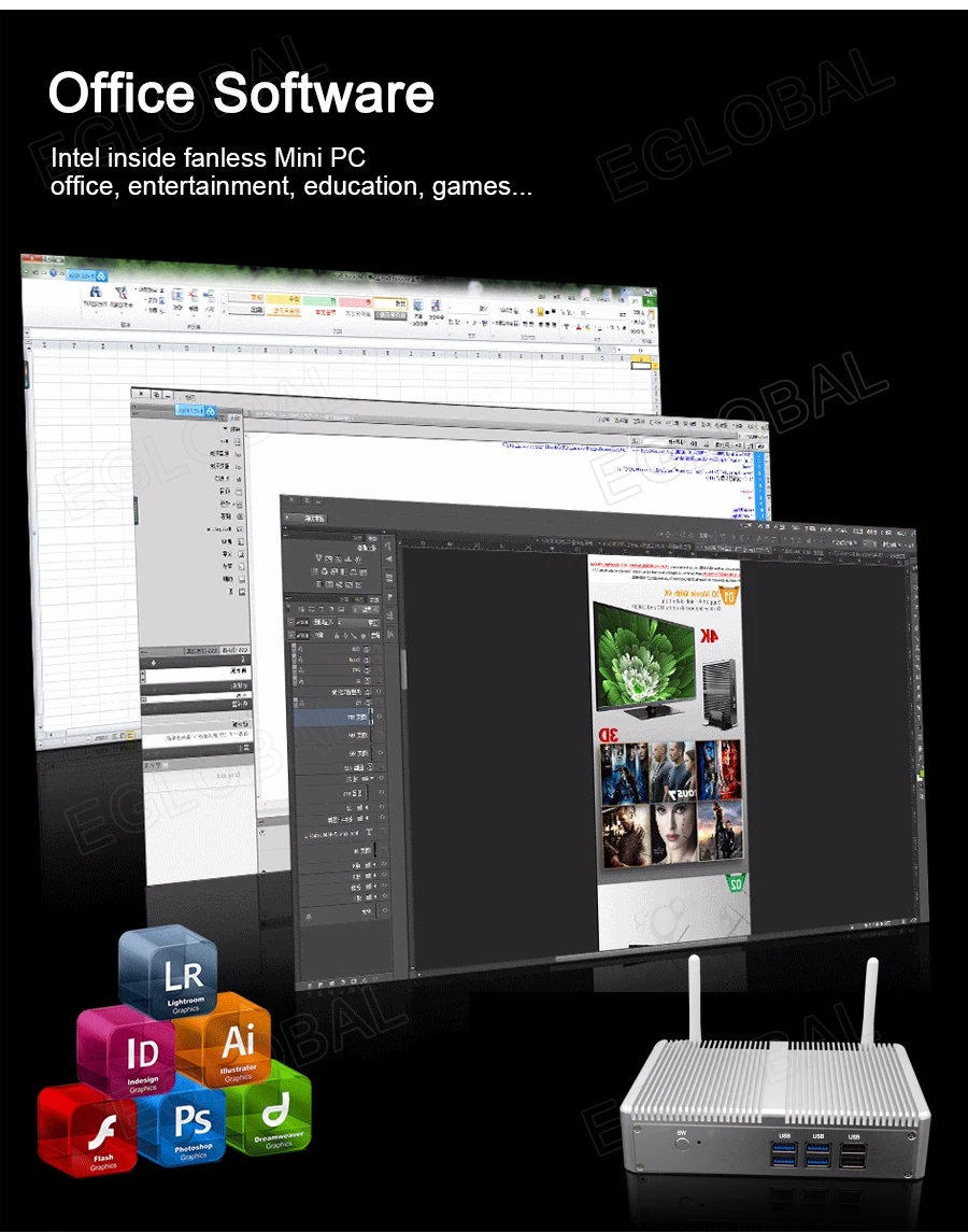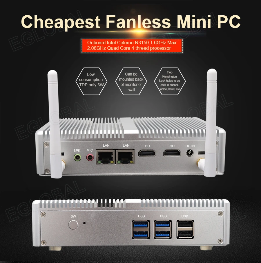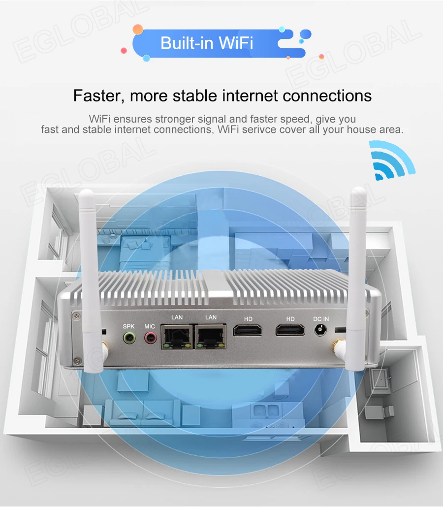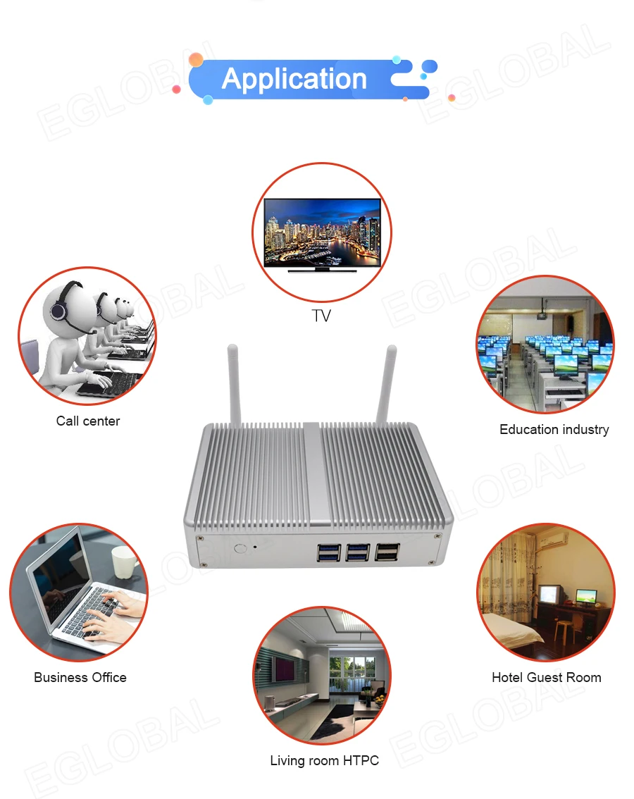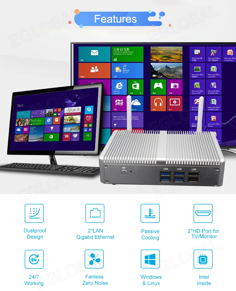 Mini PC Industrial fanless Intel 2G/4G/8G DDR3L, SSD+HDD, 2 HDMI simultânea